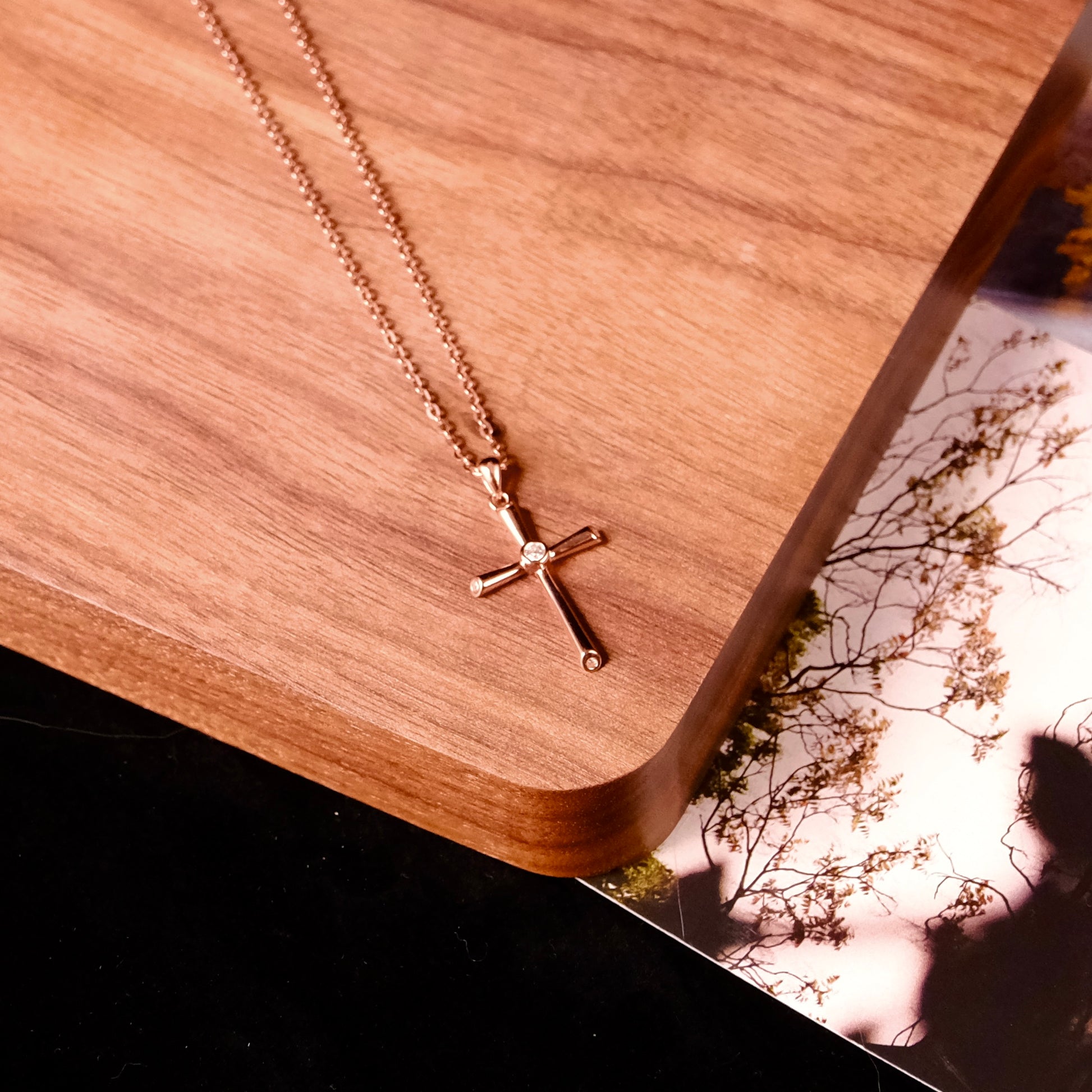 Made from 925 sterling silver and finished with stunning rose gold plating, this pendant combines durability with a modern, warm aesthetic. The soft blush tones of the rose gold symbolize love, comprehenssion, and inner peace, making it a meaningful accessory for both spiritual and fashion-forward individuals. The minimalist design with a touch of a small diamond on the cross highlights simplicity and purity, reflecting the timeless message of faith, hope, and sacrifice.
