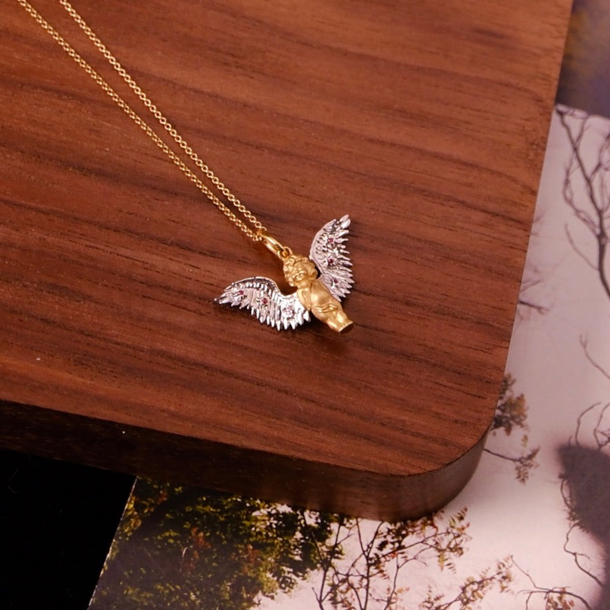 The exquisite necklace features a delicate cherub crafted in 18K gold. The fine details of the angel's wings and form evoke a sense of grace and protection, making it a beautiful symbol of love and guidance.The angelic figure is adorned with intricately detailed wings, each set with tiny, glistening ruby stones that add a hint of deep red sparkle.