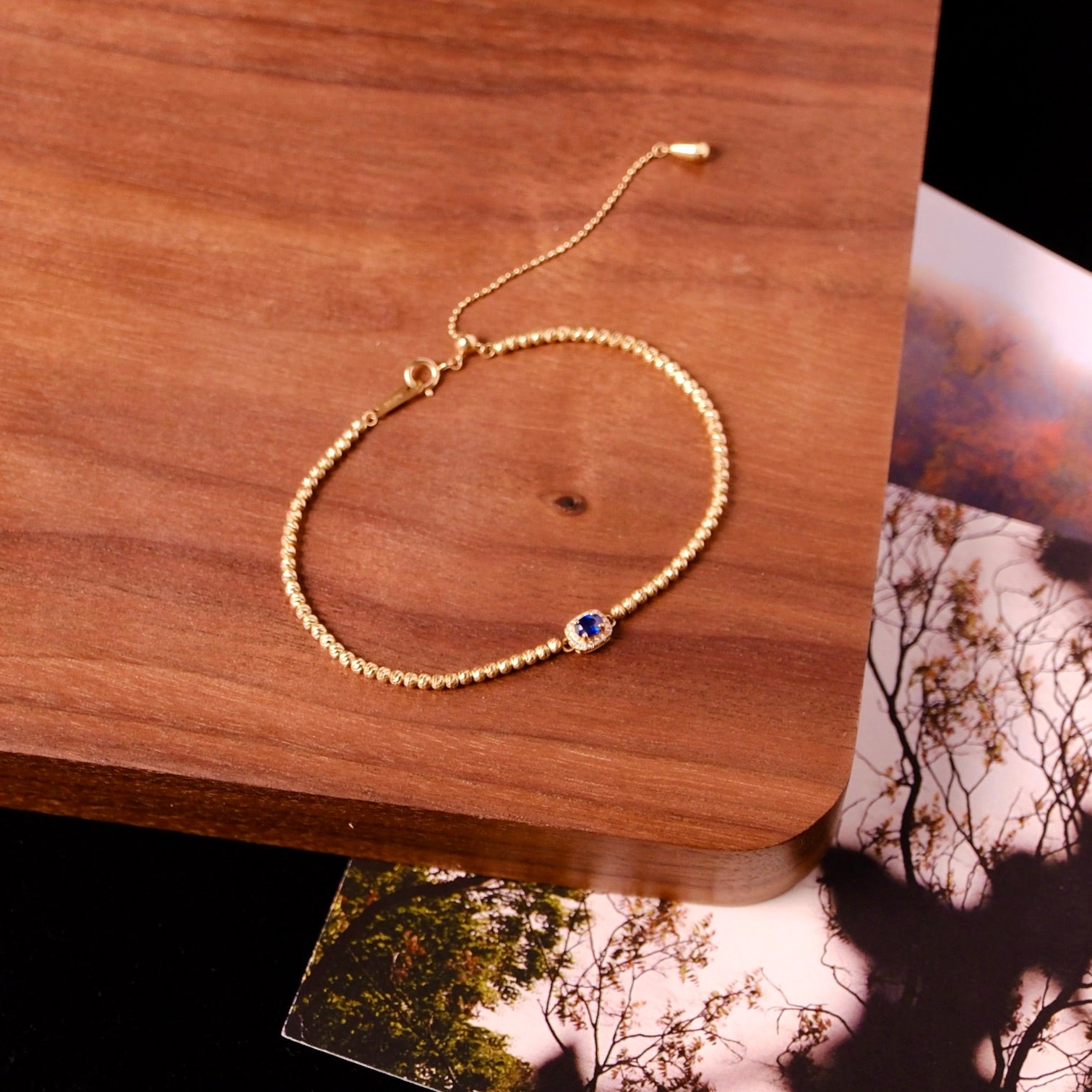 The Celestial Serenity Bracelet is a delicate yet striking piece, featuring a central 0.2-carat sapphire that gleams with a deep, celestial blue reminiscent of the night sky. The sapphire is encircled by a dainty halo of 0.05-carat brilliant-cut diamonds, enhancing its radiant allure and adding a touch of sparkle.